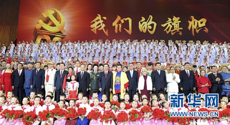 党和国家领导人胡锦涛、吴邦国、温家宝、贾庆林、李长春、习近平、李克强、贺国强、周永康出席观看晚会,与首都各界群众6000多人共同庆贺中国共产党九十华诞。
