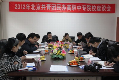 共青团北京市委2012年民办高职中专院校座谈会于3月1日在我院实训楼109室召开。团市委副书记杨海滨、大学中专部部长张秀峰、副部长高博出席本次会议,北京信息职业技术学院、北京城市学院、北京市园林学校等9所院校团委负责人参加了座谈会。