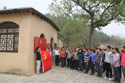 在中共七届二中全会会址门前,面对鲜红的党旗,党员们整齐列队,举起握拳的右手庄严宣誓。大家决心努力学习党章,牢记“两个务必”,践行科学发展观,坚定信念,发挥党员先锋模范作用和党支部的战斗堡垒作用,为培黎学院的科学发展贡献自己的聪明才智和全部力量!
