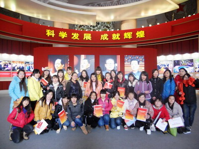 科学发展兴伟业,奋发进取谱华章。我们迈入展览馆大厅,首先映入眼帘的是毛泽东、邓小平、江泽民、胡锦涛四位伟大领袖的照片,使同学们倍感亲切。