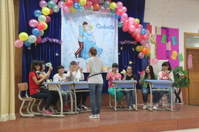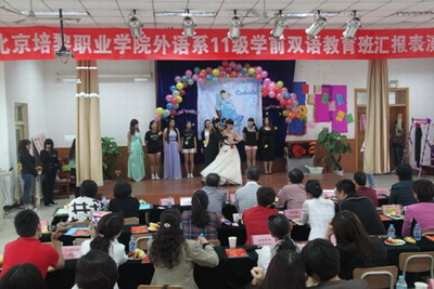 为学院建校30周年校庆献礼,也为了给2011级商务英语(学前双语教育)班学生汇报两年来的学习成果,扩大本专业在社会上的影响力,外语系于6月7日上午成功举办了首届学前双语教育方向班学生的汇报演出活动。特别邀请到中国民办教育协会学前专业委员会常务理事、海淀区教委社会力量办学管理科科长朱建新,以及北京16家幼儿园、幼教培训机构的园长、老师们,学院副院长、外语系系主任翟天利,学院副院长关仲和,以及处室和各系领导等一同观看了汇报演出。