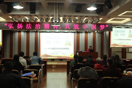 郭岱光副教授结合近期正在召开的十八届五中全会精神为切入点,向参加培训的人员指出依法治国和从严治党是“十三五”发展的重要保障。进而详细阐述了依法治国的概念、依法治国方略的形成和发展三大阶段、十八届四中全会依法治国决定的亮点,从立法、执法、司法、守法几个主要的法律运行环节谈我国要求和实际做法,并就依法治国决定对百姓生活产生的重要影响举案说法,旁征博引,与会参加培训的同志感到很解渴。