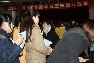 2008年12月24日9点,我院在学生活动中心举办了2009届毕业生校园双选会。20余家企事业单位应邀参加,陆续有600多名毕业生参加了此次双选会。参会同学积极地与用人单位沟通,并将精心制作的个人简历递交给了意向的用人单位。上午12点,本次校园双选会圆满结束。