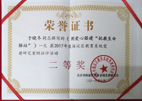 日前,在2017年度海淀区教育系统党建研究案例征评工作中,我院于晓冬同志申报的案例《用爱心搭建“抚教生命驿站”》获评二等奖。此次评选是为汇总展示全区教育系统党建工作的典型经验和创新做法,共有18个党建工作协作委员会100余篇案例参加征评,学院路学区共11人分获一、二、三等奖。