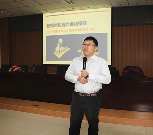 沈潜医师由推拿的释义讲起,向大家介绍了推拿手法的种类,围绕教师群体颈肩常见病重点讲解了推拿按摩手法,并通过现场演示如何按压风池穴、捏拿肩井穴等,指导在场的师生使用简单的手法来缓解颈肩的疲劳。这种讲解生动直观,非常受大家的欢迎。