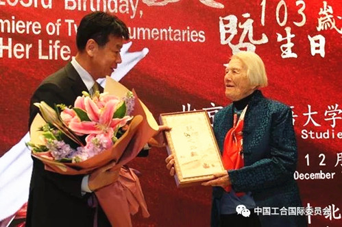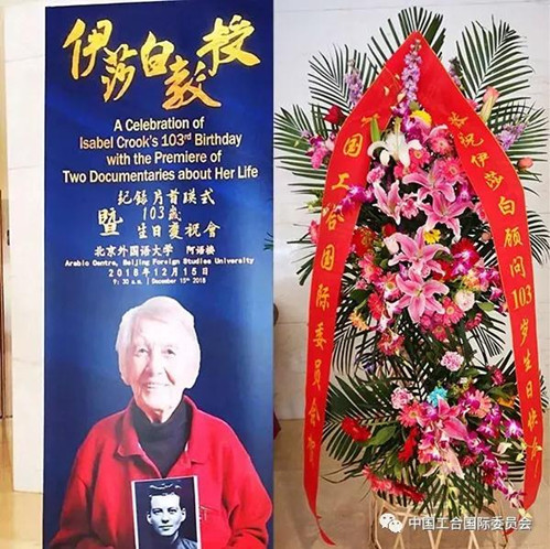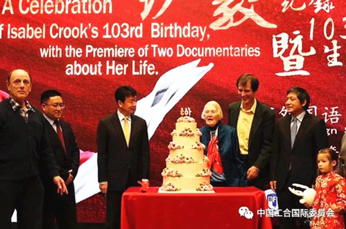 2018年12月15日上午,工合国际顾问、北京培黎职业学院顾问、资深外国专家伊莎白(Isabel Crook)纪录片首映式暨103岁生日庆祝会在北京外国语大学东院阿拉伯学院国际会议厅隆重举行。工合国际主席柯马凯,工合国际法定代表人、工合国际副主席、北京培黎职业学院院长余临及工合国际委员中村京子、唐宗焜、张爱荣、黄浣碧、江国珍、吴青等应邀出席庆祝会。