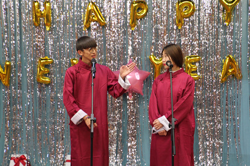 学生会李研博和杨涛两位同学助兴带来了小岳岳的经典相声《谜一样的男人》让大家捧腹大笑。