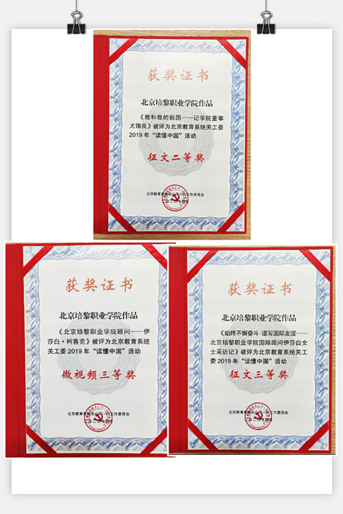 在习总书记回信三周年之际,我院报送的专访作品,经北京教育系统关工委组织专家评审,全部获奖,其中两篇征文《始终不懈奋斗、谱写国际友谊——北京培黎职业学院国际顾问伊莎白女士采访记》、《我和我的祖国——记学院董事尤锡良》分获二等奖、三等奖,微视频《北京培黎职业学院顾问——伊莎白•柯鲁克》获三等奖微视频,我院获得优秀组织奖。