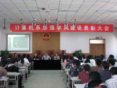 4月16日中午,我院计算机系在3号教学楼模拟法庭召开了“加强学风建设表彰大会”。出席大会的领导有:学院常务副院长尤锡良,学生处副处长张长辉,教务处副处长王旭,计算机系主任陈欢歌,副主任蒋若苏、于凤。会议由于凤副主任主持。