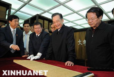 图三、国务院总理温家宝来到国家图书馆,与编辑和读者交流读书心得。这是他在国家图书馆欣赏馆藏珍品。