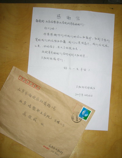 3月31日工商管理系2008级高职会展、市场、连锁班组织了为太阳村的孩子们募捐活动(祥见4月13日“校园新闻”报道)。太阳村的孩子们已收到了衣物,现在他们回了一封感谢信,现将信的内容转载如下: