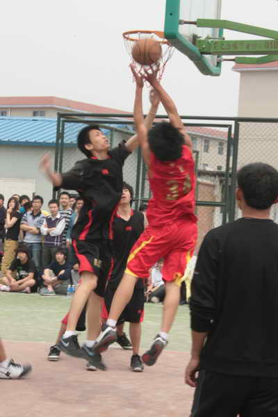 比赛场上,气氛活跃,热情高涨,两队展开了激烈的角逐,但又充满了友谊和协作的气息。运动员们在场上奋力的拼搏,他们个个身轻如燕,凶猛如虎,没有了平日读书时的文气——都是为了团队的荣誉。每一个转身,每一次投篮都展现了男生的绝佳球技,引来场边女生的一片尖叫。每投进一个都会使场边的人高兴地手舞足蹈。不进球时,他们也会拼命地继续喊加油来鼓舞士气。为全院师生演绎了一场精彩的篮球赛。