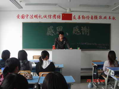 4月29日上午,我院国际商务系2007级国际贸易专业高职4班组织了纪念温总理亲书校训及复信一周年主题班会。班会采取分小组选代表,分别陈述自己观点的方式进行。班会由班长张宏达主持。