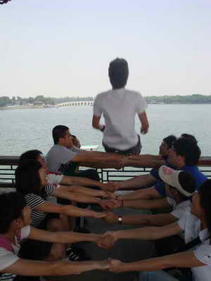 到达颐和园后,我们全体成员首先合影留念,前排同学手拿团旗和系旗,以表示我们这个团队是积极向上、充满活力,坚决跟中国共产党走的。在公园里,我们大家一起嬉戏、游玩、唱歌、钓鱼,显现了年轻干部的青春与活力。我们还组织了拓展训练。这个活动要求大家必须完全相信对方,体现团队精神。在训练过程中大家都克服了心理障碍,做到真正的相认同伴,相信团队的每一名成员。负责保护的同学,更是非常紧张,尽最大努力不让同伴受到任何伤害。我想这个能力拓展训练不仅考验了大家的信任度,更是增强了同学间互助的责任感。我们在游玩的同时,不忘沟通平日里工作的经验、体会,以及各自的不足,消除了一些误解,真正达到了使大家劲往一处使的目的。
