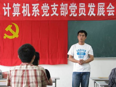 5月28日下午,我院计算机系党支部在1号教学楼402教室召开了党员发展会,讨论何磊、张乐两名同学的组织发展事宜。参加会议的有党支部的正式党员和预备党员、入党积极分子等。会议由计算机系主任兼党支部副书记陈欢歌老师主持。