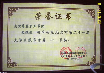 由北京高教研究会数学学会和北京数学会高职高专委员会联合主办、北京科技大学承办的北京市第21届大学生数学竞赛,于2010年10月30日在北京科技大学举行。全市共有70余所高校的4200余人参加了此项竞赛。我院财会金融系2008级会计5班张银银同学获得高职高专组一等奖。