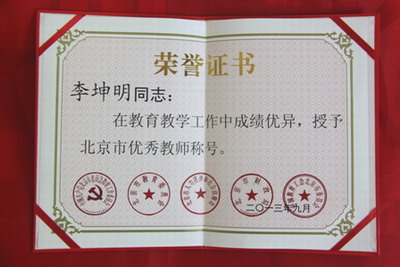 在第29个教师节来临之际,学院按照《完美在线登录官网认真做好2013年“北京市优秀教师”和“北京市优秀教育工作者”评选表彰工作的通知》的有关精神,在各部门推荐、有关部门联评、院长办公会审议通过、公示后,推选李坤明同志为“北京市优秀教师”人选。经北京市委教育工委、北京市教委、北京市人力社会局等五个部门评选决定:授予我院李坤明同志“北京市优秀教师”光荣称号。