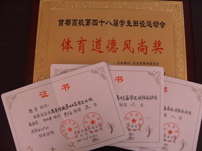 我院首次参加首都高校田径运动会取得佳绩!我院获得了“体育道德文明风尚奖”。财会金融系09级学生沈宇获得男子1500米跑第三名、5000米跑第六名,外语系08级学生孙语屿获得女子200米跑第八名的好成绩,为我院争得了荣誉。
