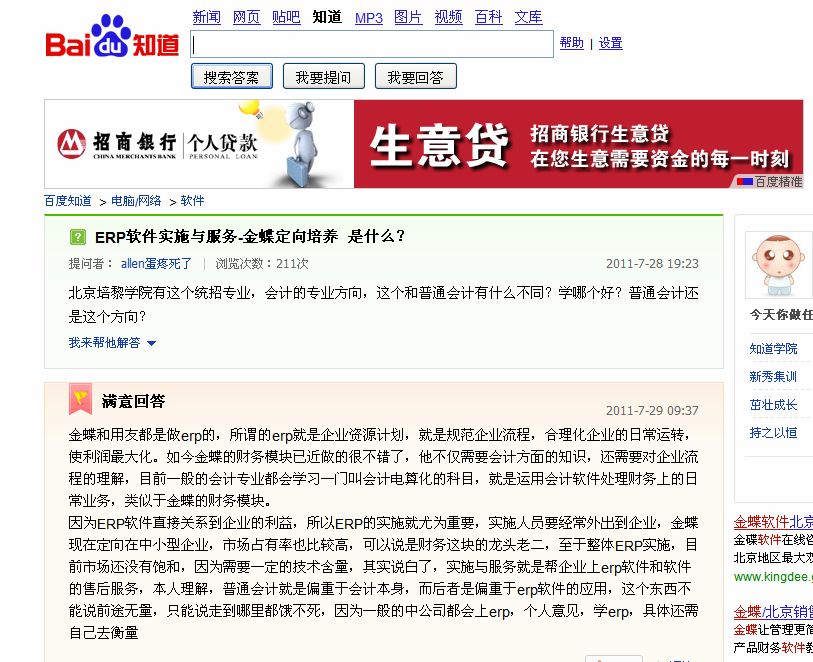 “百度知道栏目”读者对会计(ERP软件实施与服务)专业的提问与回答