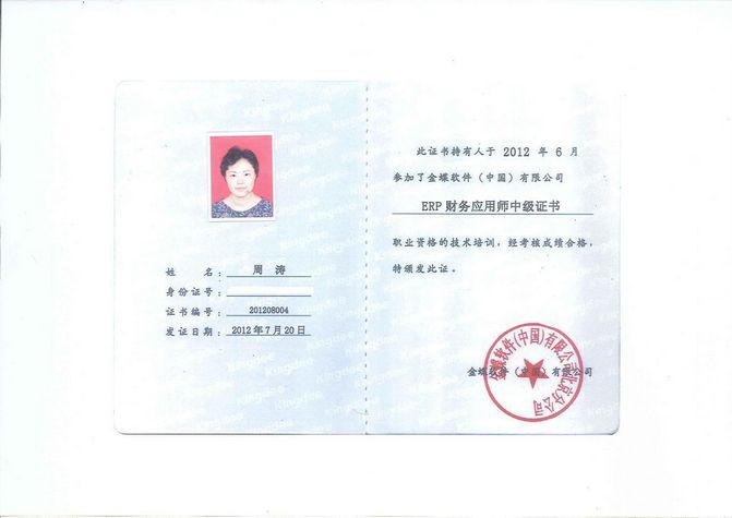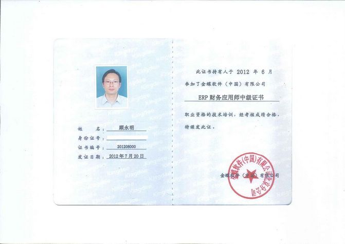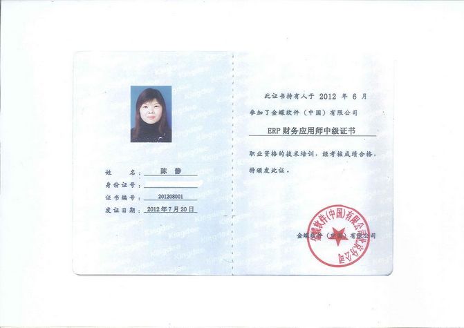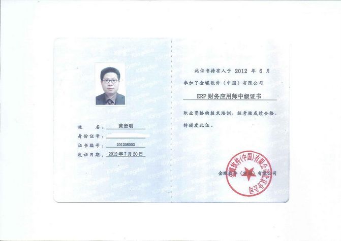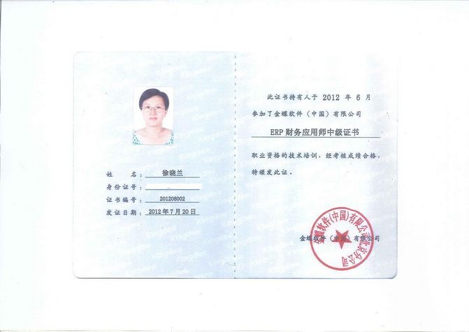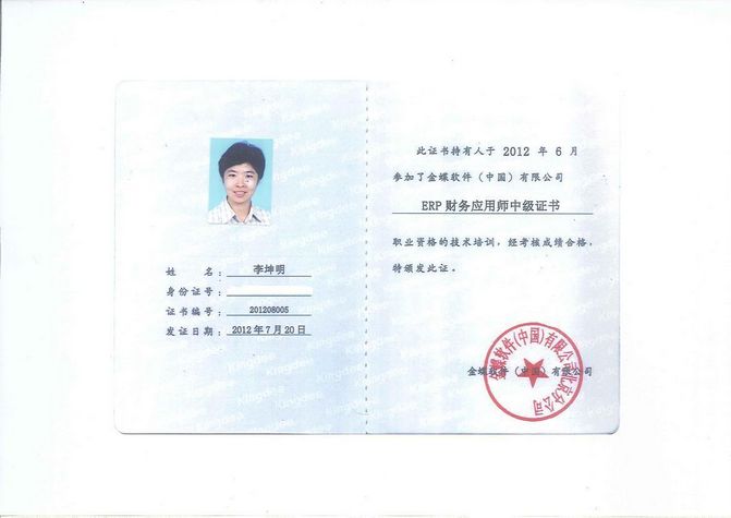 专业教师取得的金蝶公司认证的“ERP财务应用师中级证书”