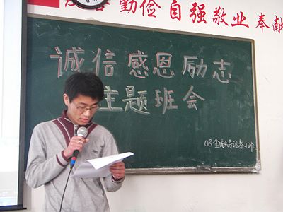 2010月5日7日上午十点,08级金融与证券高职一班全体同学在三号教学楼310教室进行了以“诚信、感恩、励志”为主题的班会。
