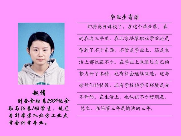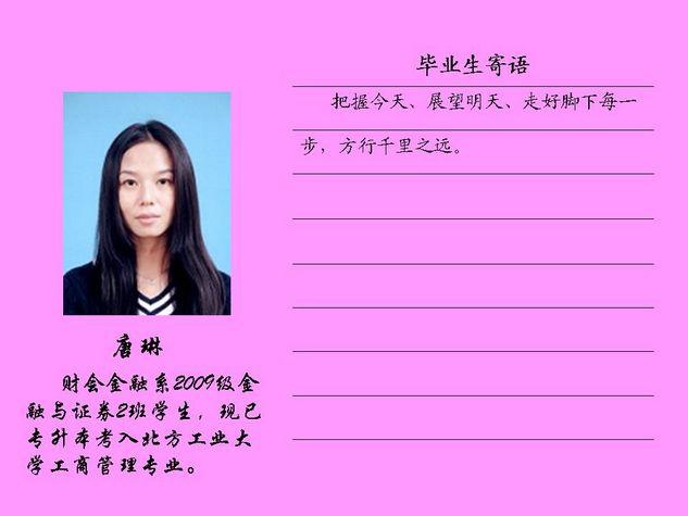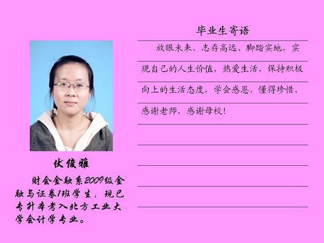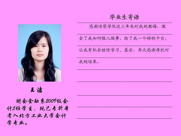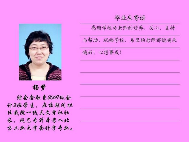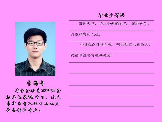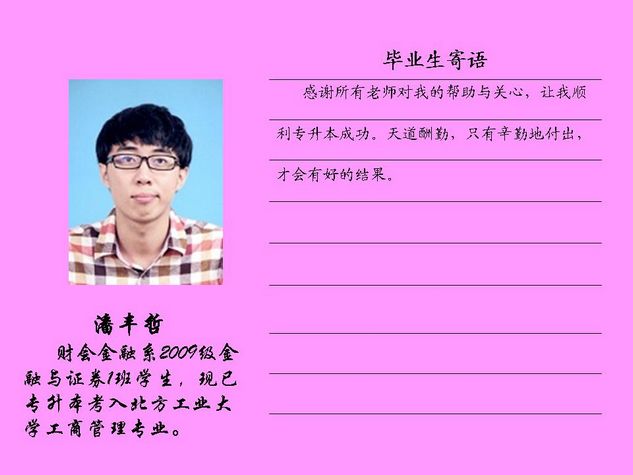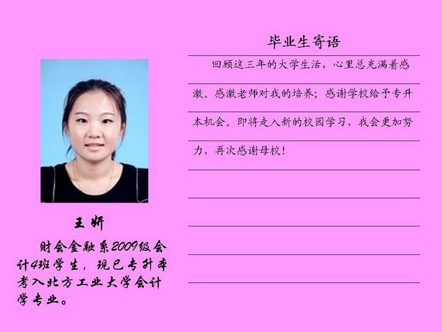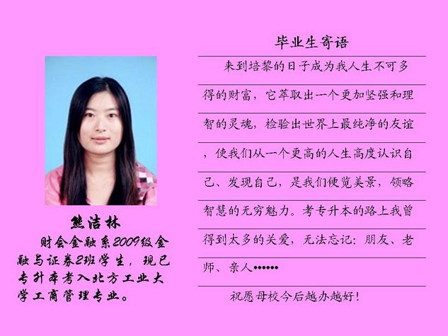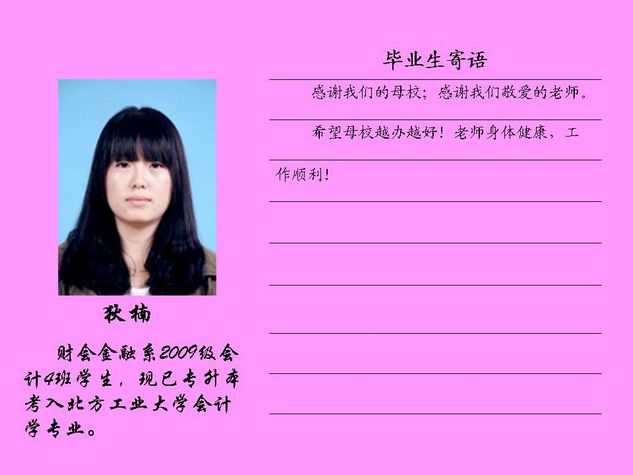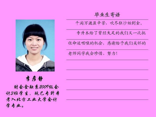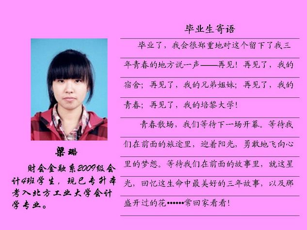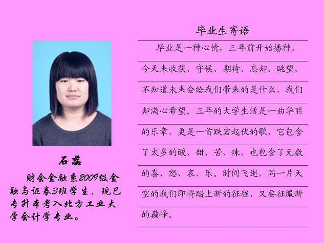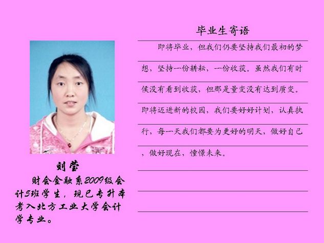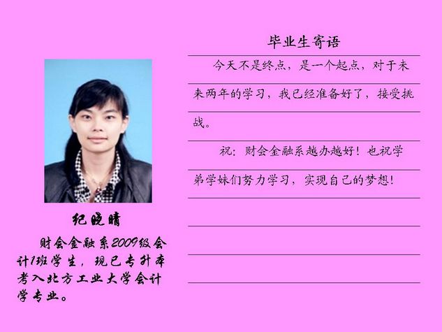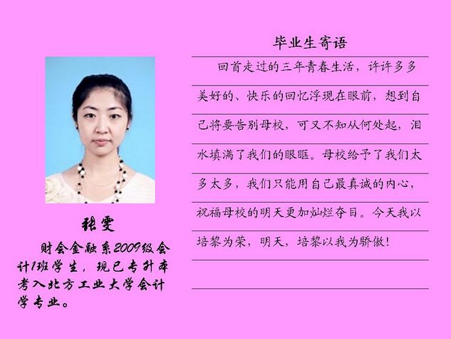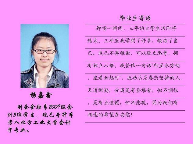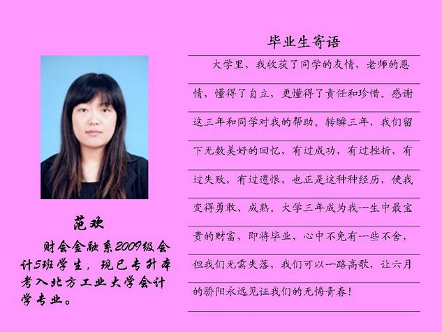财会金融系2012届毕业生共有43名同学被北方工业大学录取,录取率为81.10%,比2011届高出10个百分点。现将他们的毕业寄语刊登如下: