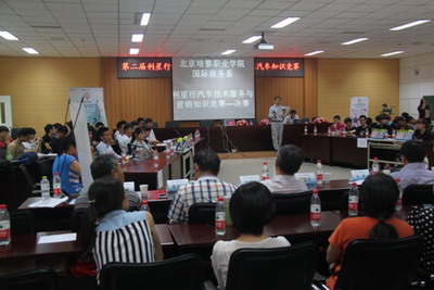 2014年6月13日下午2点,北京培黎职业学院国际商务系“第二届利星行汽车技术服务与营销专业汽车基础知识竞赛”决赛在图书馆报告厅顺利举行,学院院长余临、党委副书记尤锡良、常务副院长关仲和,副院长翟天利、杨永安,利星行集团企业事务部经理李扬女士、中国汽车流通协会副秘书长王都先生、中国315法律网主任郝庆丰先生等嘉宾出席了决赛。在谢晶老师的主持下,比赛过程高潮迭起、扣人心弦,最终“Perfect Star队”夺得本次比赛的第一名。