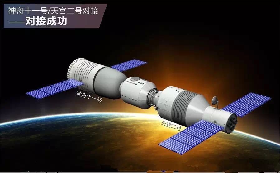 在科技人员精确控制下,神舟十一号载人飞船经过多次变轨,于19日1时11分转入自主控制状态,以自主导引控制方式向天宫二号逐步靠近。经北京航天飞行控制中心就对接准备状态进行最终确认,神舟十一号开始向天宫二号缓缓靠拢。3时24分,神舟十一号与天宫二号对接环接触,在按程序顺利完成一系列技术动作后,对接机构锁紧,两个飞行器建立刚性连接,形成组合体。在完成各项准备后,19日6时32分,航天员景海鹏、陈冬先后以漂浮姿态依次进入天宫二号实验舱。