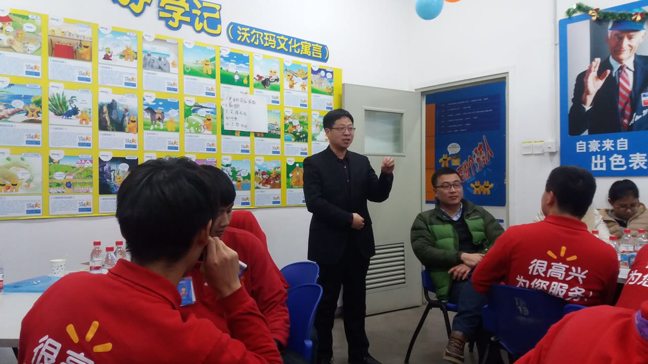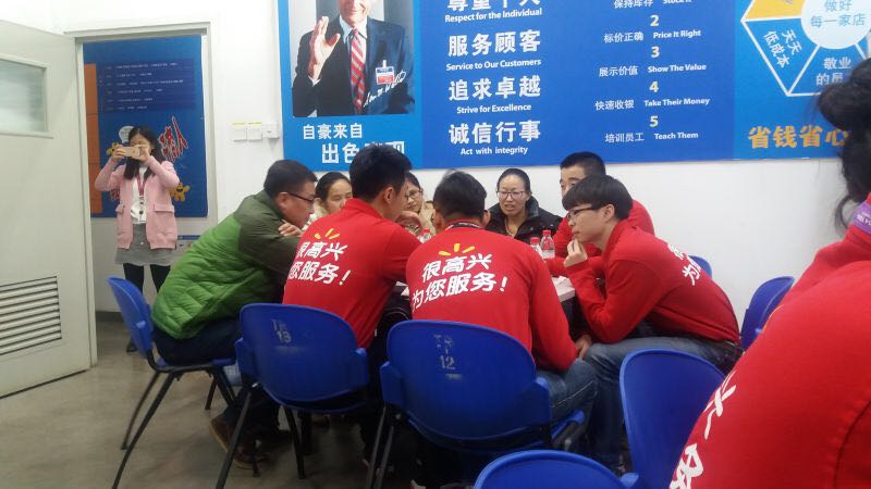 欢送会首先运用了沃尔玛特有的企业文化精神来对学生进行分组,一方面是调动气氛,另一方面也是在考察学生对沃尔玛企业文化的掌握,并设立了奖惩环节,激励大家。接下来开始了互问互答环节,同学们就实习期间在沃尔玛发现的问题及解决方法展开了总结归纳。讨论后对于运营、服务、管理等三个方面发表了自己的看法和建议,之后店长和前台经理为大家从不同角度进行了耐心细致的解答。