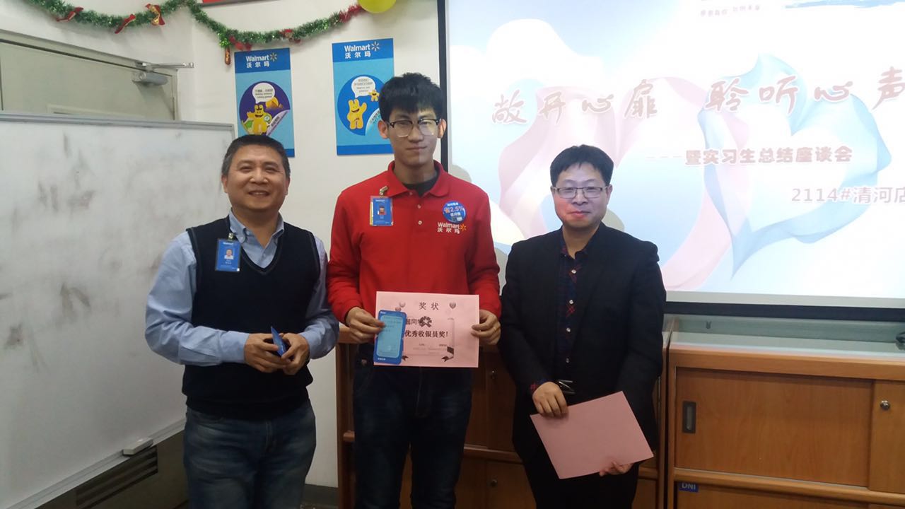 最后沃尔玛公司领导和我院领导一同为实习生颁发了“实习先锋”、“微笑大使”、“优秀收银员”、“优秀迎宾员”等奖项,对大家的工作给予了高度的赞赏。