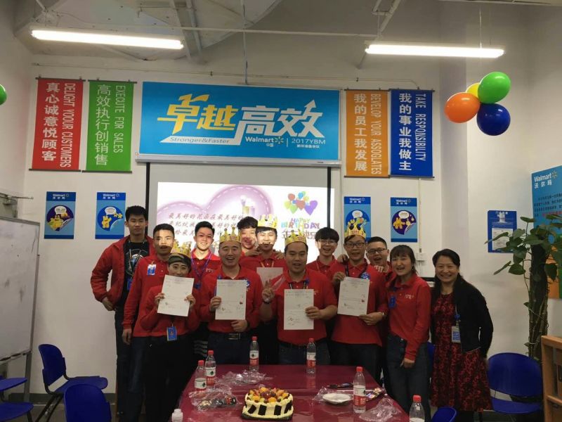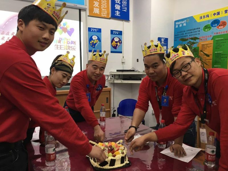 座谈会开始前,门店为大家准备了丰富的水果、小吃及各种甜点,让原本紧张的气氛瞬间变得温馨柔和。本次会议一共分为三个环节,第一个环节是岗位实习心得交流。此环节中分配在不同岗位的同学各抒己见,分享了自己在学习工作当中的收获和所存在的困惑。店长郭生东先生语重心长,细心的为大家一一解答了提出的问题,并且鼓励大家积极开拓进取,让自己的实习之旅有所收获。第二个环节是对未来设想和人员考核的商议环节,此环节中沃尔玛提出了三套考核方案让大家进行补充和选择,最终确定将以“促销竞赛”的方式对同学进行考核。第三个环节充满了温馨与神秘,沃尔玛为本月过生日的5位同学举办了一场简短、难忘的生日庆祝。生日歌、祝福、蜡烛、贺卡、蛋糕样样俱全,让工作在企业中的同学们深深感到了归属感和企业以人为本的文化氛围。