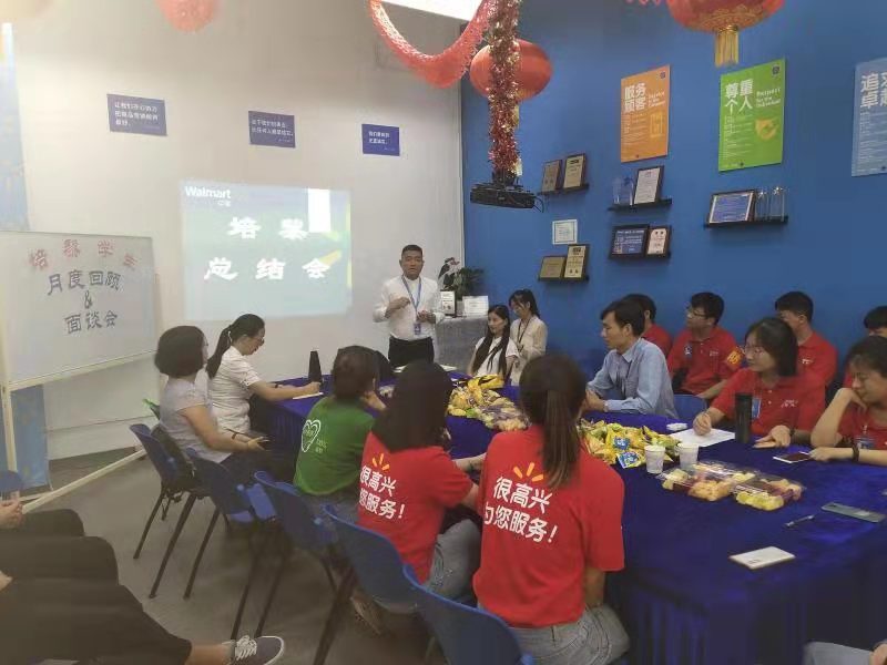王怀旭总经理分析了沃尔玛成长的经历和未来发展的前景,并以自身我例子,向同学们讲授职业规划相关内容;发放点赞卡并祝贺。钱会敏、张文苑分别针对学生进店一个月的表现进行发言,并鼓励学生再接再厉。最后学生直面沃尔玛的领导,提出工作中遇到的问题,并提出解决方案,获得沃尔玛领导的好评。