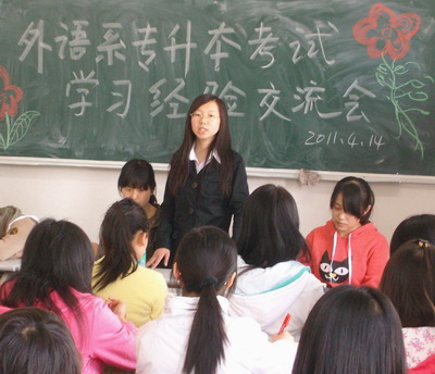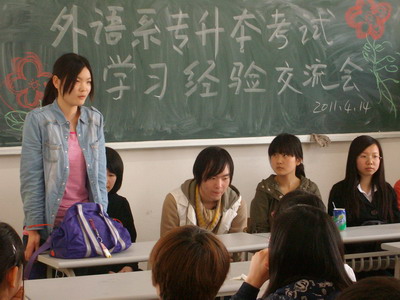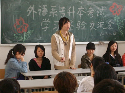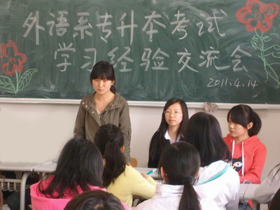 会上,贾国帅、殷馨等同学结合自己的亲身经历以及今年专升本的实际情况,分别从考前如何收集资料、端正上课态度等方面与在座的同学进行了深入的交流,并对平时的学习方法、学习态度以及专升本复习期间的心态调整等问题提出了相应的建议。恳切的言辞,幽默诙谐的谈吐,使同学们在轻松的氛围中既详细了解了专升本考试的基本情况,又学会了英语等级考试的备考方法和技巧。