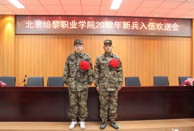 2012年12月7日下午,我院在新图书馆报告厅隆重举行2012年新兵入伍欢送大会,张文智同学代表15名新入伍的同学发言,表示绝不辜负学院领导、老师对他们的栽培和希望,到部队后一定要奋发图强积极工作,为培黎争光、为北京争光、为祖国争光。