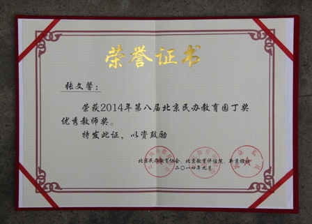 2014年9月10日,由北京民办教育协会、北京教育评估院和新京报共同主办的第八届北京民办教育园丁奖颁奖典礼在北京教育考试院举行,北京培黎职业学院外语系实用英语教研室主任张文馨喜获“北京市民办教育园丁奖——优秀教师”奖,教务处处长黄贤明与张老师一起参加了颁奖典礼。