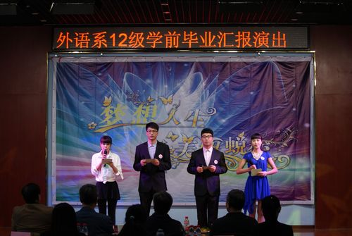 《like water》一段动感十足的现代舞拉开了本场演出的序幕,同学们用她们青春的自信,洒脱的舞步,感染着在场的每一位观众,把她们朝气活力的一面展现得淋漓尽致。童话剧《绿野仙踪》充满童趣的演绎风格,又仿佛使我们置身于美妙的童话世界,感受了一段神奇的异国之旅。还有趣味英语课堂采用寓教于乐的教学方法,更是充分展示了学前学生的专业基础能力。最后,2012级学前双语教育专业全体同学怀着对母校的无限眷恋和对大学生活的不舍之情,满含热泪地献上诗朗诵《我们毕业了》,感动了全场观众,赢得了台下雷鸣般的掌声。