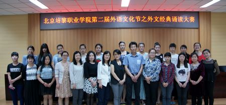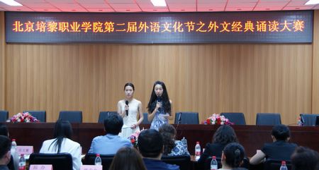 为丰富校园文化生活,激发学生学习英语的兴趣,鼓励学生诵读英语文章,进而培养语感,提升校园文化品味,营造浓厚的英语学习氛围,外语系于2015年5月22日在图书馆一层报告厅成功举行了“北京培黎职业学院第二届外语文化节之外文经典诵读大赛”活动。