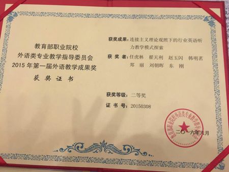 近日,从全国职业院校外语教学工作会议上获得喜报,我院联合华北电力大学共同申报的《连接主义理论观照下的行业英语听力教学模式探索》教学成果在教育部职业院校外语专业教学指导委员会2015年第一届外语教学成果评审中获得行业外语类二等奖。