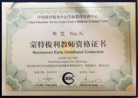 中国教育服务中心学前教育培训中心颁发的蒙特梭利教师资格证书