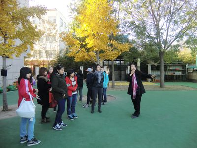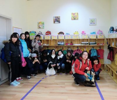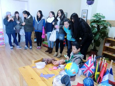 同学们先后被安排到国际幼儿园和早教中心进行参观。在参观的过程中,她们了解到幼儿园的环境创设情况,还分组进到班级中去,实地观摩了幼儿园的课堂教学活动,孩子们流利的外语以及中外教默契的课堂分工合作,都给同学们留下了深刻的印象,有不少同学都感叹道:“这里的小朋友英语讲得真好,我们回去也要努力学好外语呀!”。通过此次观摩学习,同学们进一步认识到目前自身存在的差距,从而更加明确了今后努力的方向。