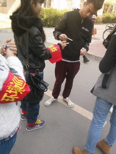 10月24日中午12:00,外语系组织五位文明督导员同学,对学院的三个餐厅、北操场以及校园主要道路等公共场所进行了禁烟巡查,开展用“一颗口香糖换一支香烟”的活动。督导员们带着“环境巡查”的红袖箍,在这些公共场所一旦发现有吸烟的同学,他们就会面带微笑,礼貌地上前进行劝阻,劝告他们熄灭手中的烟,向他们宣传我院禁烟政策,并递上一颗口香糖换取他们手中正在点燃的香烟。督导员们每当遇见吸烟的同学都认真的进行劝解,吸烟的同学都主动将烟熄灭,并表示抱歉,下次将不会再犯。经过短短1个小时的巡查,督导员们共查获了15支香烟。